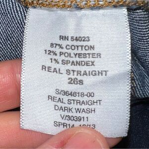 Women’s size 26 real straight dark jeans waist is approximately 13.5 rise is approximately 8.5 , inseam is approximately 27 inches, good used condition.
