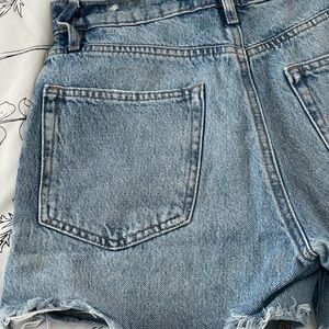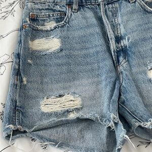 Stylish distressed denim shorts perfect for casual outings. Features a classic blue color with a trendy worn look.