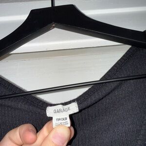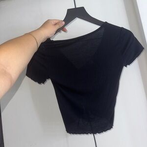 Chic black tee with gathered front. V-neck style. Ideal for everyday wear.