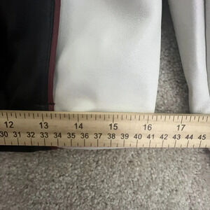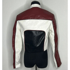 Stylish bomber jacket with black and white design. Features red accents. Perfect for casual wear.
