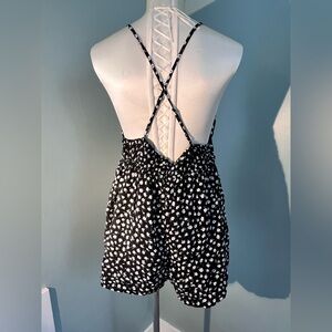 Chic black jumpsuit with white floral pattern. Features a deep V-neck and adjustable straps. Perfect for casual outings.