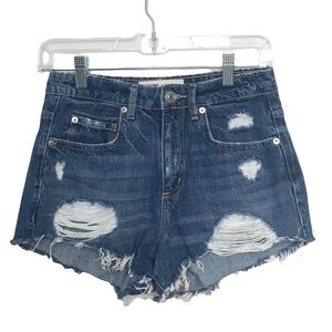 Blue, 100% cotton, hi rise distressed shorts with raw hem and button /zip fly. Preowned but in good condition.