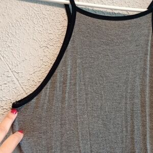 Chic charcoal maxi dress with thin straps. Perfect for casual outings. Soft and stylish.
