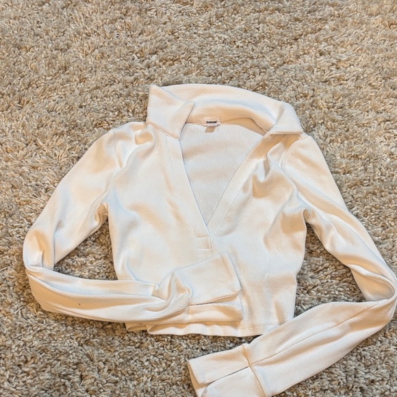 Stylish cream ribbed top by Garage. Features a classic collar and deep V. Size XS No signs of wear
