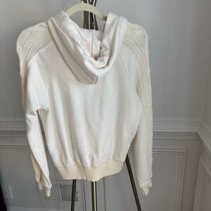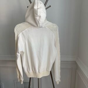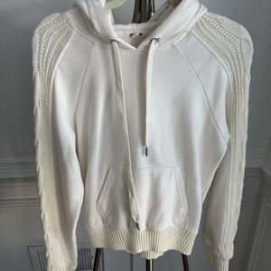 Chic cream sweater with knit accents. Features a cozy hood and front pocket. Ideal for layering. Fleece interior to keep you warm. Size small.