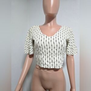 Chic blouse with a stylish tie-back design. Features cream and black stripes. Ideal for casual wear.