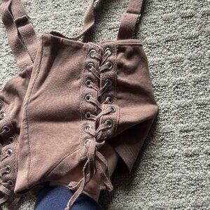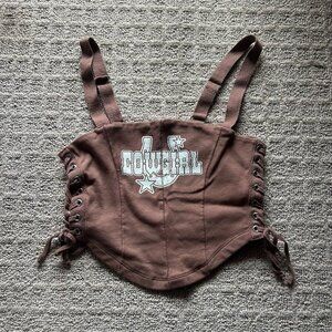 This Garage Crop Top in women's size small features a stylish cowgirl character with embroidered accents, perfect for a party or line dancing event. The sleeveless design, lace-up closure, and cropped style add a trendy touch to this brown top. Whether for a summer dance night or a winter wardrobe update, this blouse is lined for comfort and has a regular fit, making it a versatile and fun addition to any girl's closet.