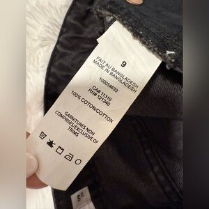 The product is a pair of women's festival shorts in size 9, made by the brand Garage. These black denim shorts feature a distressed look, perfect for a festival theme. The cut-off style adds a trendy and casual touch to the overall design, making them a great choice for a day of music and fun in the sun. Made from denim fabric, these shorts offer both style and durability for a comfortable and fashionable look.