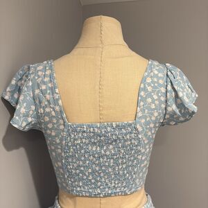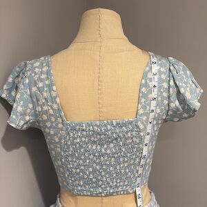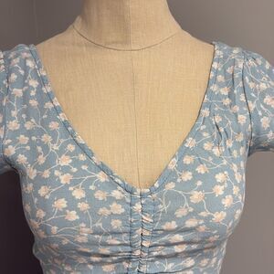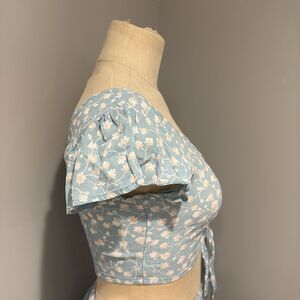 Excellent condition garage floral crop top with gathered front, elastic stretch back and ruffle sleeve. Size XS - 55% viscose and 45% rayon machine wash cold. See pictures for length and armpit to armpit measurement.