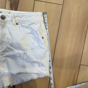 Chic white jean shorts with frayed hem. Distressed details for a trendy look. Ideal for casual wear.