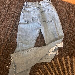Classic straight fit jeans. Light blue color. Modern distressed wear