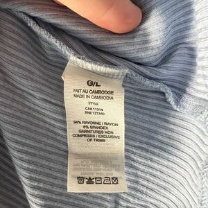 Keep it cute and casual with this soft blue ribbed crop tee from Garage, size G/L (equivalent to Womenโs Large). This fitted tee features a stretch rib knit with a subtle sheen, short sleeves, and a classic crew neckline. Its flattering cropped cut makes it perfect for pairing with high-rise jeans, shorts, or a flowy skirt.