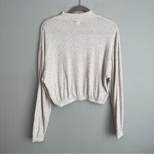 Soft and stylish ribbed knit sweater. Features a high neckline and long sleeves. Perfect for layering.