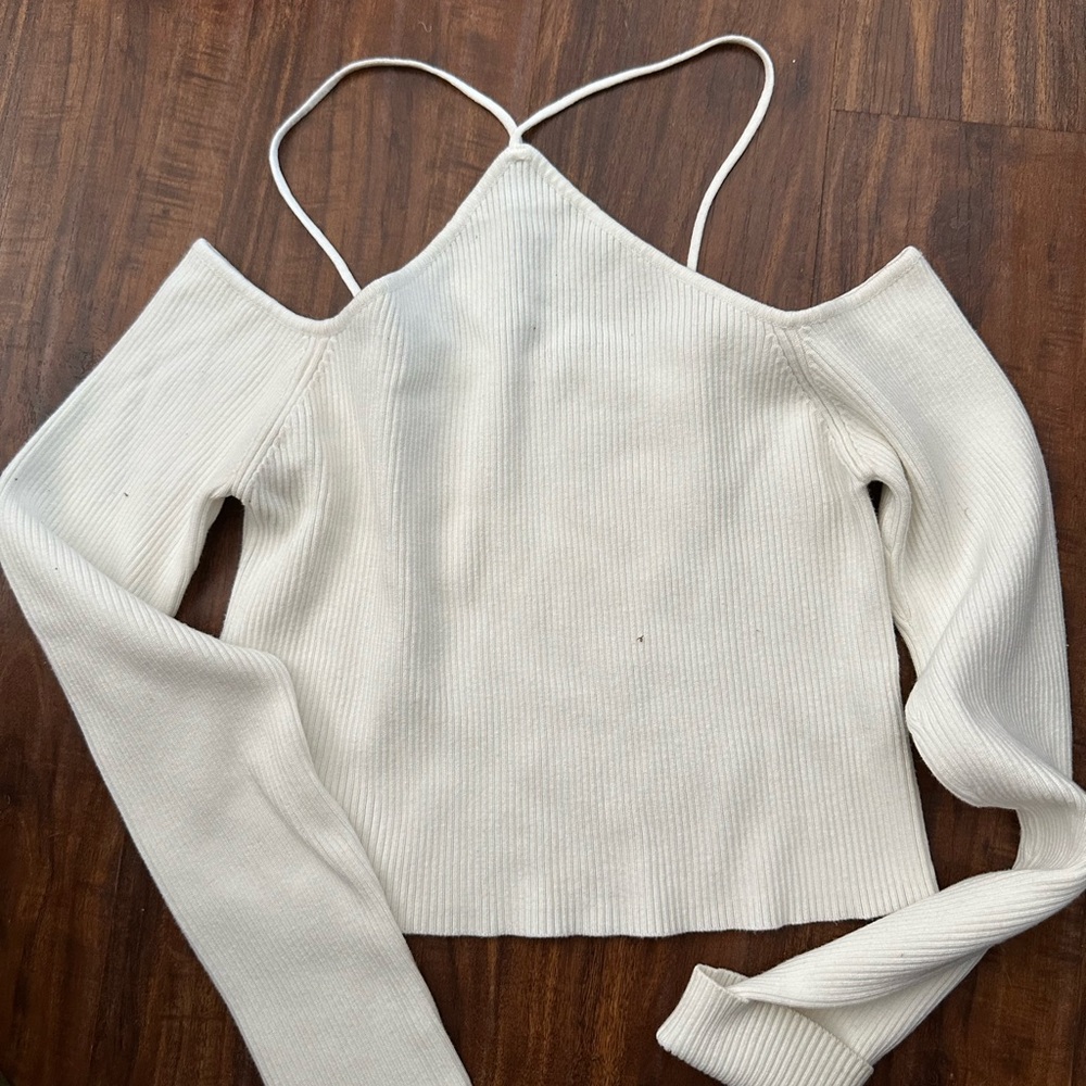 Elegant ribbed knit top by Garage. Features a chic cold shoulder design with spaghetti straps.