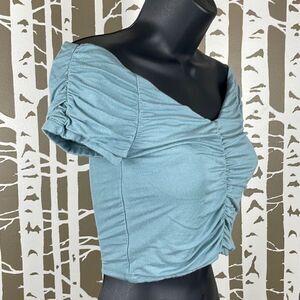 Measurements (laying flat): 14" shoulder to shoulder, 12.5" pit to pit, 11.25" across hemline, 4.75” sleeve length, 14.25" top of shoulder down to hemline.