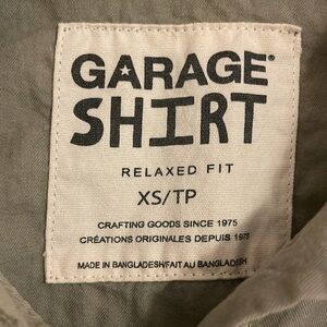 Garage shirt relaxed, fit extra small olive green color front shirt pocket full button up button cuff sleeves emblem on same left side hem high low hem.