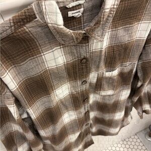 Garage Tan and Cream Checkered Plaid Top. Women’s size XS/S. Flannel shirt.