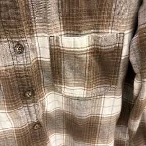 Plaid flannel button-up shirt by Garage. Features tan and cream colors.