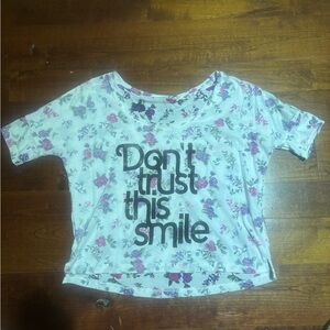 Chic white top with floral print. Features bold text design. Perfect for casual wear.