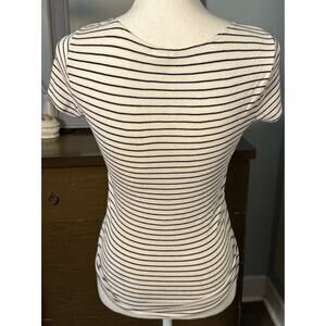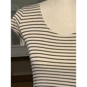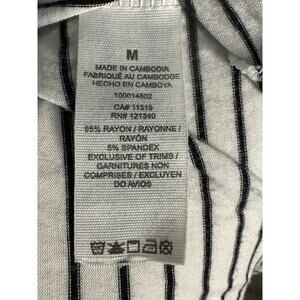 The Garage White short sleeve t-shirt with black stripes in medium size is a stylish and versatile addition to any woman's wardrobe. Made from a blend of spandex and rayon, this top offers comfort and flexibility. The classic scoop neck and basic style make it easy to pair with various bottoms for a casual yet chic look. With its white color and black stripes, this t-shirt is a timeless piece that can be dressed up or down for any occasion.