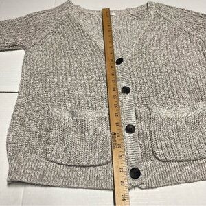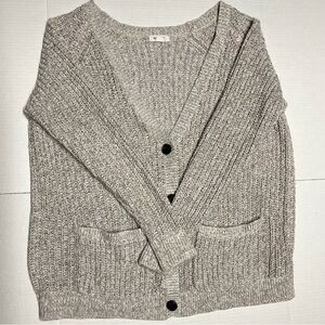 Chic taupe cardigan with button front. Soft knit texture. Ideal for layering.