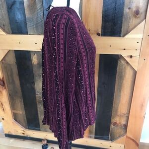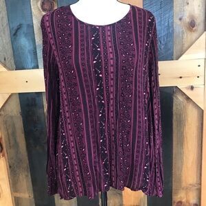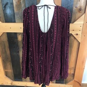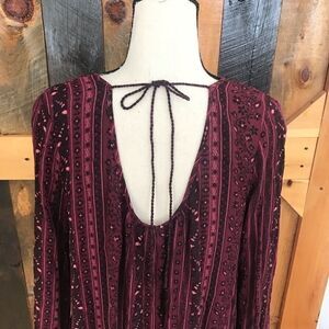 Garage brand boho peasant style blouse with tie in the back . Loose fit, size S. Elastic at cuffs. Background is burgundy with black and pink design. Approximate measurements are pit to pit flat 20”. Rounded bottom, longer in back.