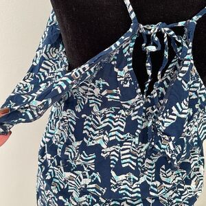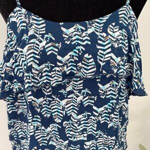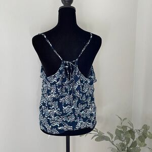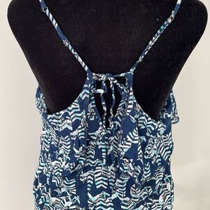 Description: Cute rayon tank top. Ruffle top and flowy waist line. Ties in the back. Feather print