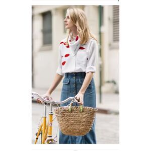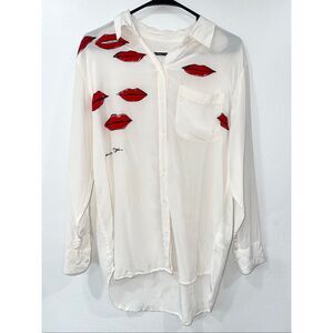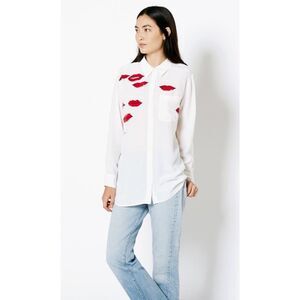 Garance Doré x Equipment exclusive red lips Daddy White Bright silk print blouse