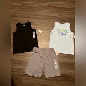 Includes black tank, light blue tank with graphic, and gray shorts. Comfortable and stylish.