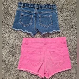 Chic denim shorts paired with vibrant pink shorts. Perfect for play and casual wear. Comfortable and stylish. Bundle. Size 4T. Elastic waistband. Button and zipper closure. Frayed bottom. Super cute shorts. Distressed denim material.