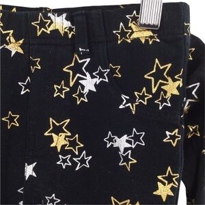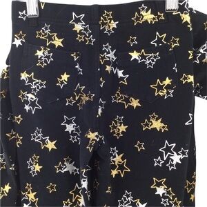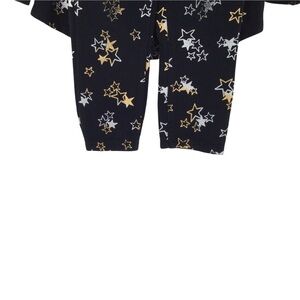 top has long sleeves, scoop neck, pleated front with matching pants both have gold & silver Stars