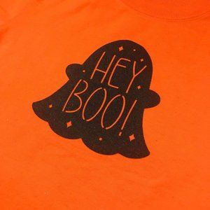 Shirt is used and in good condition. I added the "Hey Boo" heat-transfer vinyl design.