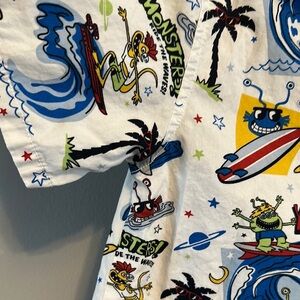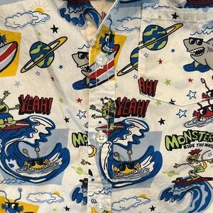 This Garanimals button-down shirt features a vibrant and playful print on a white base with blue accents. Its casual, relaxed fit and short sleeves make it perfect for a fun day out. The shirt's design includes whimsical illustrations that evoke a summer vibe.