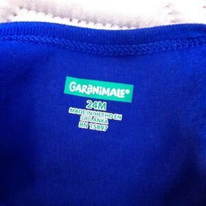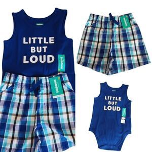 Garanimals' "Little But Loud" Sapphie blue sleeveless onesie with complementary blue plaid shorts is size 24 mos. Shorts are non-stretchable cotton with gathered waist to easily pull over diapers, and has a decorative tie at the front waist. Plaid is varying shades of blue and white with black stripes.