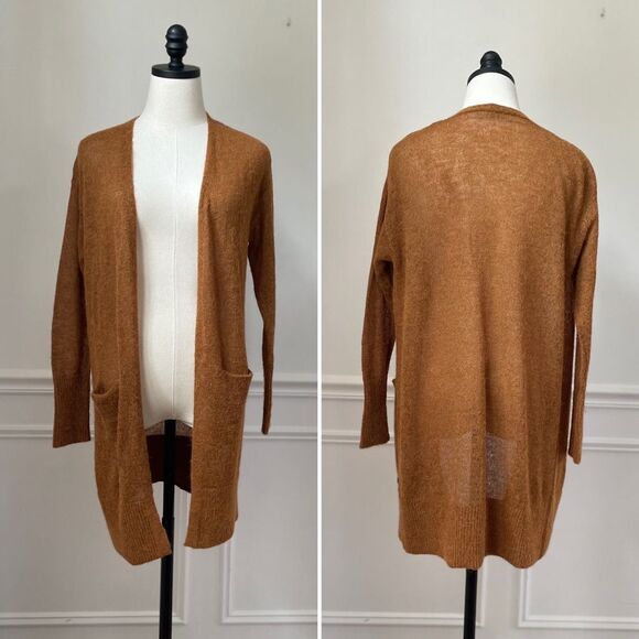 Garcia jeans featherweight open front cardigan. Two front hip pockets. The color can best be described as butter scotch. It is a cross between tan, harvest gold and pumpkin orange. 35% acrylic, 34% alpaca and 31% polyamide. Measurements are approximate and taken while laying flat: 32 inches shoulder to hem and 20 inches armpit to armpit with the open front touching