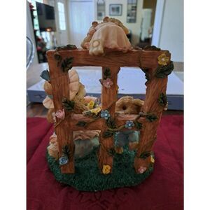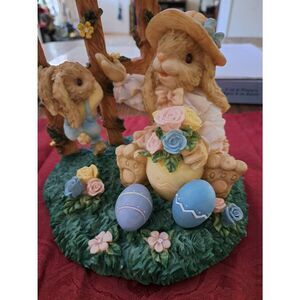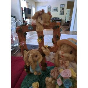 Good used condition. This charming resin garden bunny figurine features a mama rabbit with two baby bunnies climbing a garden trellis. She wears a cute Easter bonnet with a bow and holds flowers in a vase shaped like an Easter egg. Surrounded by grass, pastel flowers, and Easter eggs, this sweet spring decoration measures approximately 8 inches by 7–7.5 inches. Perfect for Easter or spring home decor, table displays, or as a collectible figurine. Thanks for looking and have a blessed day. Crate Item #12412
