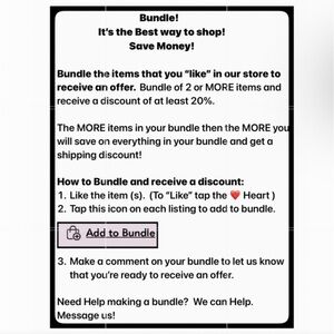 A Bundle of 2 or more items typically are eligible for a price and shipping discount . If you need help or have questions on how to bundle, please ask. We are here to help