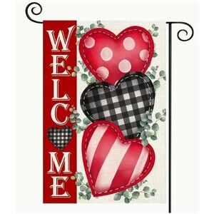 This listing is for a Garden Flag Welcome with Hearts Valentine's Day 12x18in Double sided. 100% Polyester. Machine wash on cold. NEW!