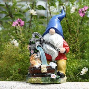 GNOMES GARDEN KIT: As you can see in this garden statue, an adorable garden gnome is pumping water into a barrel to bathe his dog, including details like soap bubbles, brush/towel, flowers, etc. At dusk, the water will automatically glow with blue light. Place it where you want it to, and it will keep working for you every day.