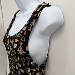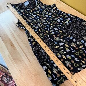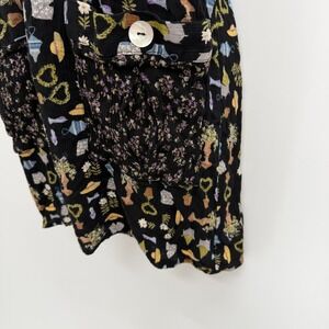 Rabbit Rabbit Rabbit Designs sleeveless pinafore apron dress features a whimsical garden-themed novelty print on a crinkle-textured black fabric. This playful piece includes large front pockets with decorative pearlized button accents and a scoop neckline. The back is finished with a button-down closure, adding a vintage-inspired touch to the overall silhouette. Perfect for layering over a simple tee or wearing on its own for a cottagecore-inspired look.