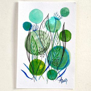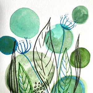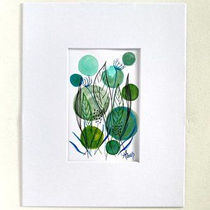‘Garden Party’ is an exciting original one-of-a-kind minimalist floral plant theme handmade watercolor painting by Artist Tristina Dietz Elmes.