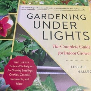 Discover tips for gardening under lights and beyond. This is a gently used book about gardening. It is a color hardcover gardening book.