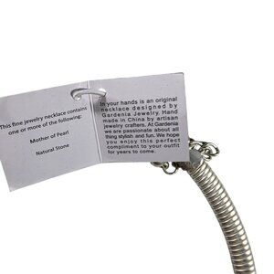 This necklace features handcrafted details with mother-of-pearl and black floral accents. The adjustable clasp ensures a comfortable and elegant fit.
