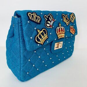 Garell Blue Quilted Denim Backpack HandEmbellished with Crown Design Fashion Bag