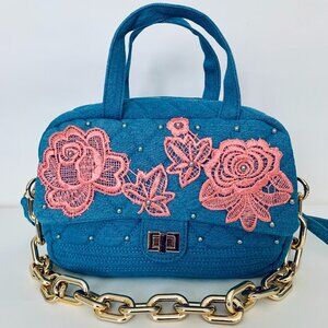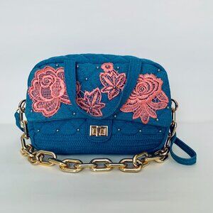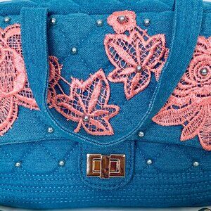 The Garell Blue Quilted Denim Backpack is a stylish and unique fashion bag that is hand-embellished with a crown design. This medium-sized rectangular backpack features a zip closure, blue denim exterior, and blue hardware accents. The bag is adorned with beaded and applique details, giving it a designer touch. Handmade by the brand Garell, this backpack is perfect for women who appreciate fashion and quality craftsmanship.