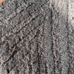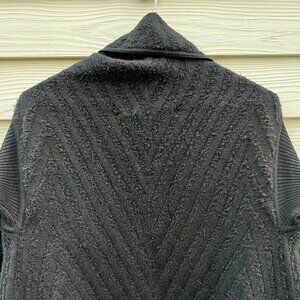 Black knit Gareth Pugh shawl wrap cardigan sweater. Long cardigan. Super unique designer piece but easily wearable. Sleeves are a knit fabric with some stretch while the rest of the sweater is a different knit with textures diagonal stripes. Cardigan is fully open and drapes with the front like waves.