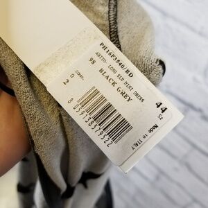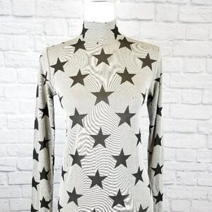 New with tags long sleeve mini dress. Sheer black stars on a gray background. Made in Italy. Mock turtle neck. Back zipper. Stretchy. The fabric is quite thin and unlined. 15" pit to pit, 36" long.