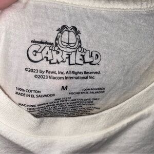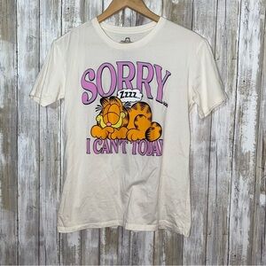 White t-shirt featuring a Garfield graphic with 'Sorry I Can't Today' text in pink and orange.