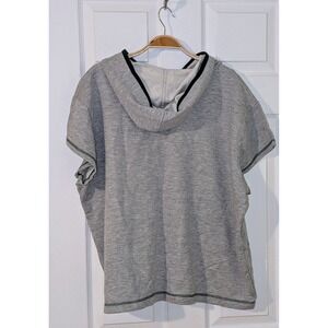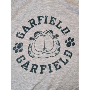 Eye-catching short-sleeve hoodie featuring the iconic Garfield character. This gray sweatshirt top showcases a bold Garfield graphic on the front, complete with paw prints and the Garfield name in a circular design. The hoodie includes a contrasting black trim around the hood and sleeves, adding a stylish touch to the casual design. Perfect for lounging at home, casual outings, or adding a fun, nostalgic element to your everyday wardrobe. ** Please see measurements. Fits like an XL or XXL.