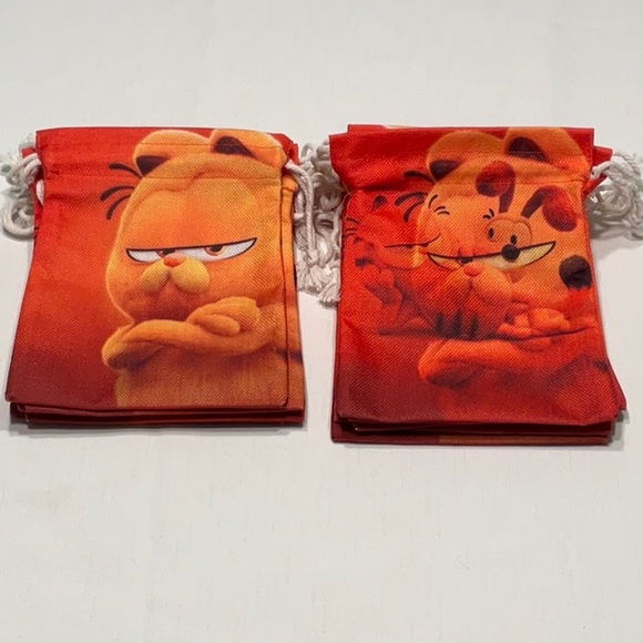 Set of red drawstring bags featuring Garfield. Perfect for small items.